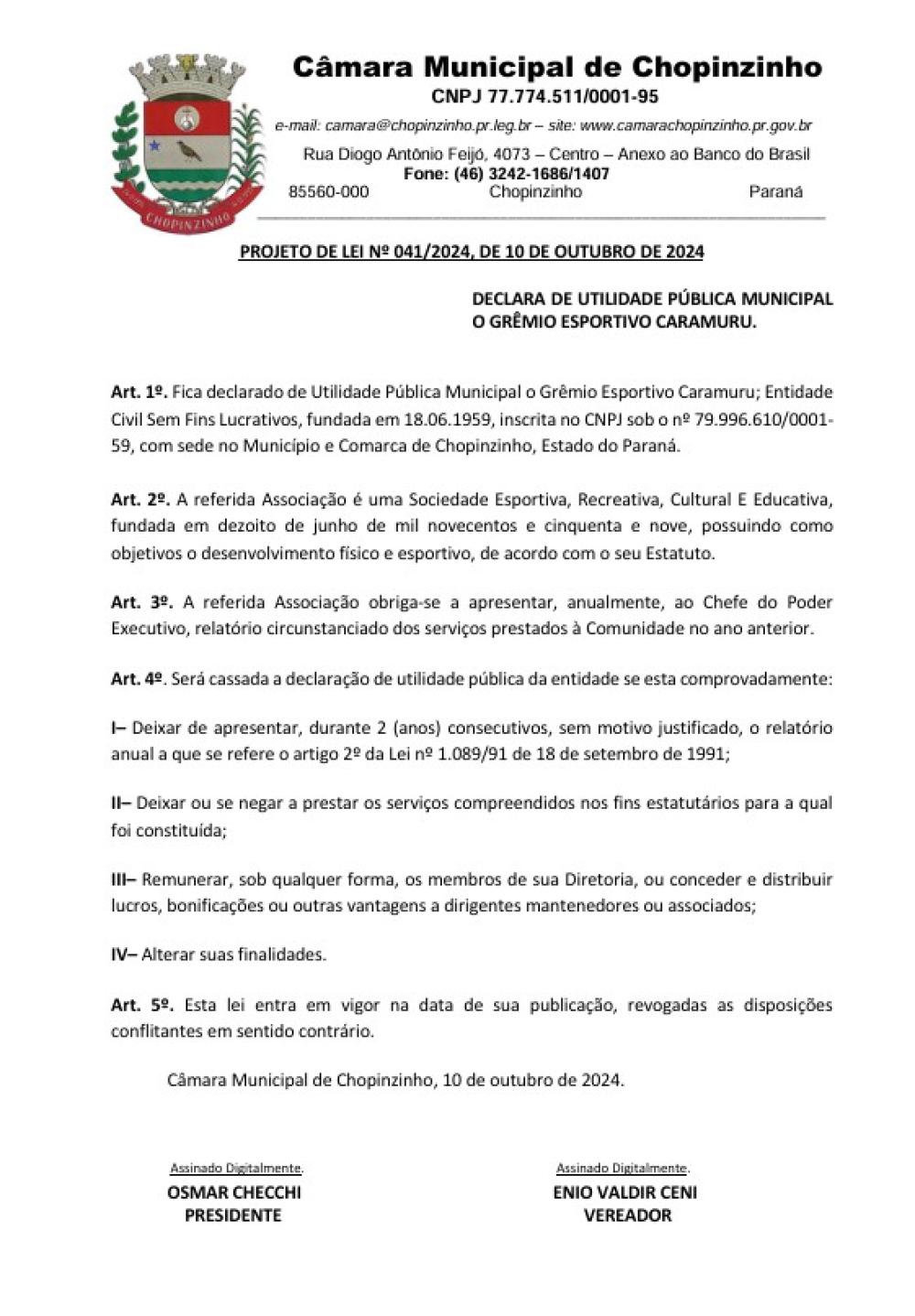 Aprovado em 1° votação o Projeto de Lei Ordinária nº 41 de 2024, que declara de Utilidade Pública Municipal o Grêmio Esportivo Caramuru