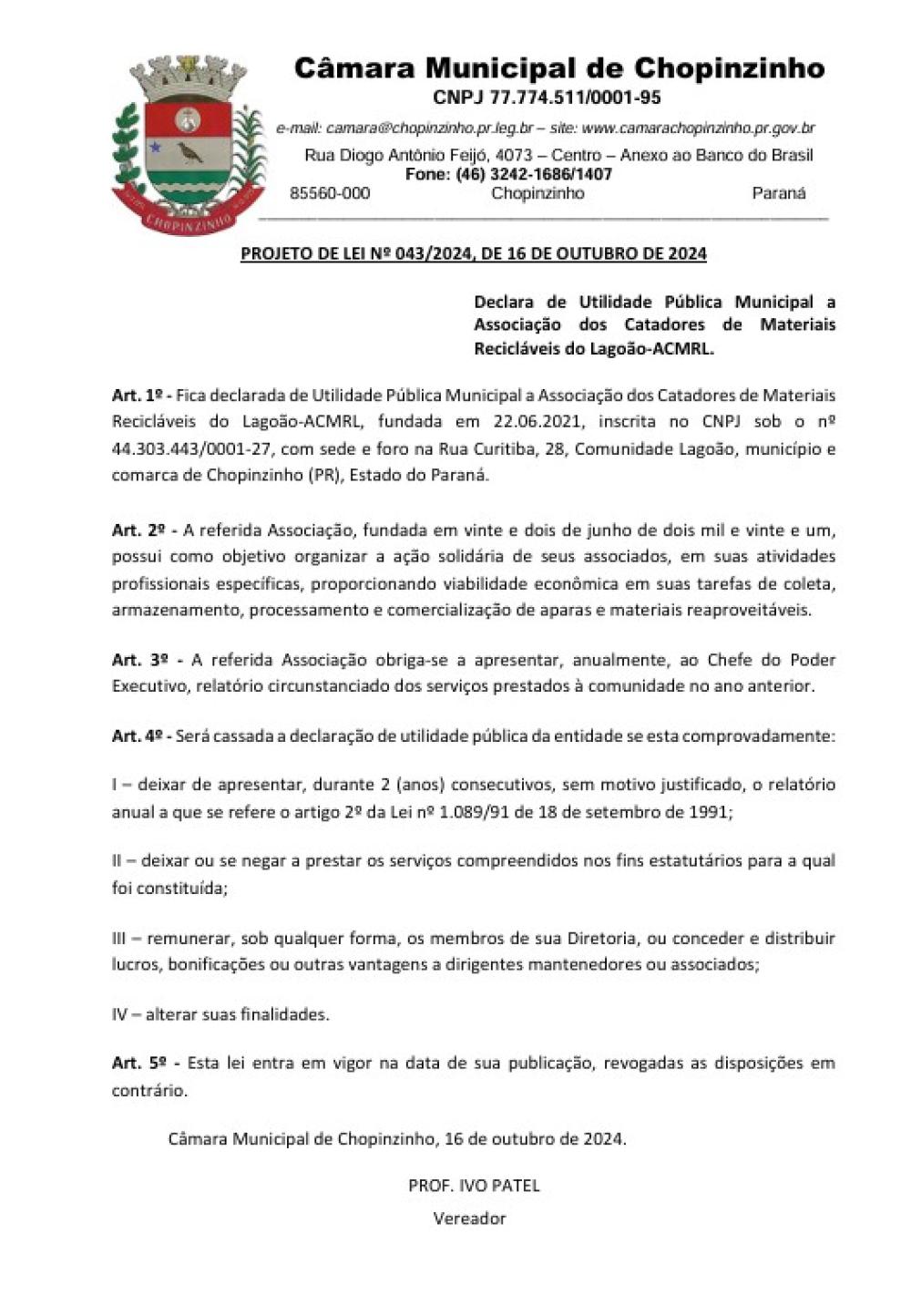 declara de Utilidade Pública Municipal a Associação dos Catadores de