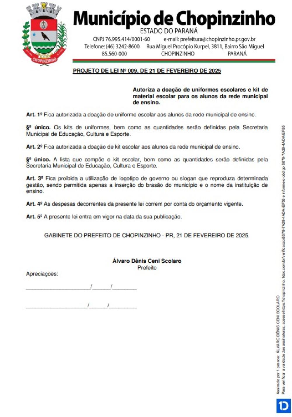 E 1° votação do Projeto de Lei Ordinária nº 9 de 2025 que autoriza a
