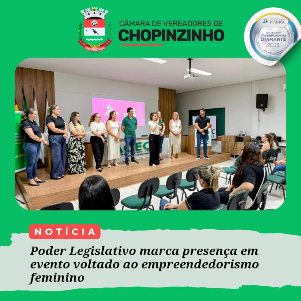 O Poder Legislativo de Chopinzinho esteve representado no lançamento oficial da Feira da Mulher Empreendedora, que integra a programação do Dia da Mulher Chopinzinhense 2026.A Câmara Municipal esteve presente por meio da presidente do Legislativo, Lídia Posso, da Procuradora da Mulher, Rosani Checelski, e da Procuradora Adjunta, Loi Ceni, que também exercem a função de vereadoras.A participação reforça o compromisso do Legislativo com ações que incentivam o empreendedorismo feminino e valorizam o papel da mulher na sociedade.Poder Legislativo MunicipalCompromisso com a comunidade.