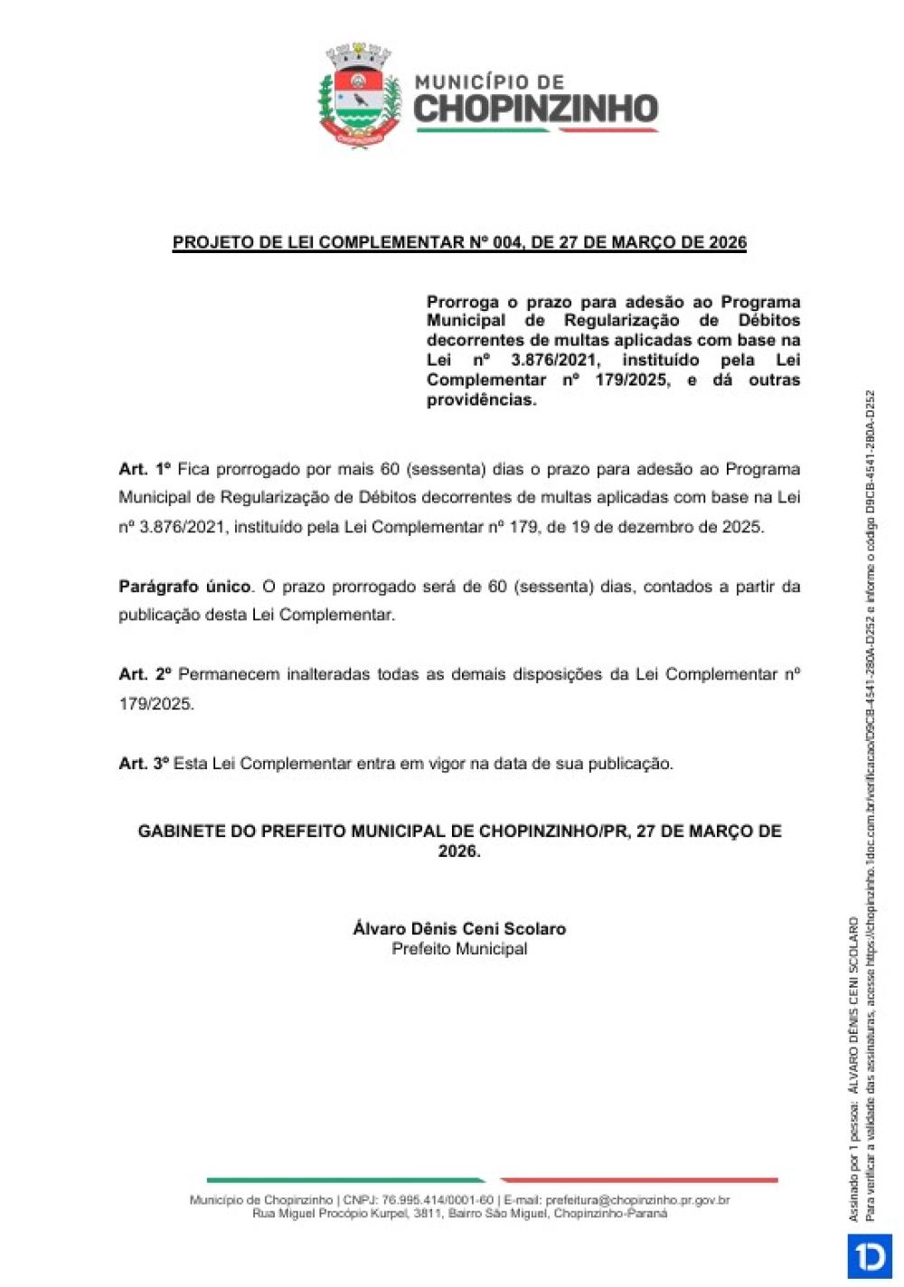 O Projeto de Lei Complementar nº 4/2026, de autoria do Poder Executivo, prorroga por mais 60 dias o prazo para adesão ao Programa Municipal de Regularização de Débitos decorrentes de multas aplicadas com base na Lei nº 3.876/2021.