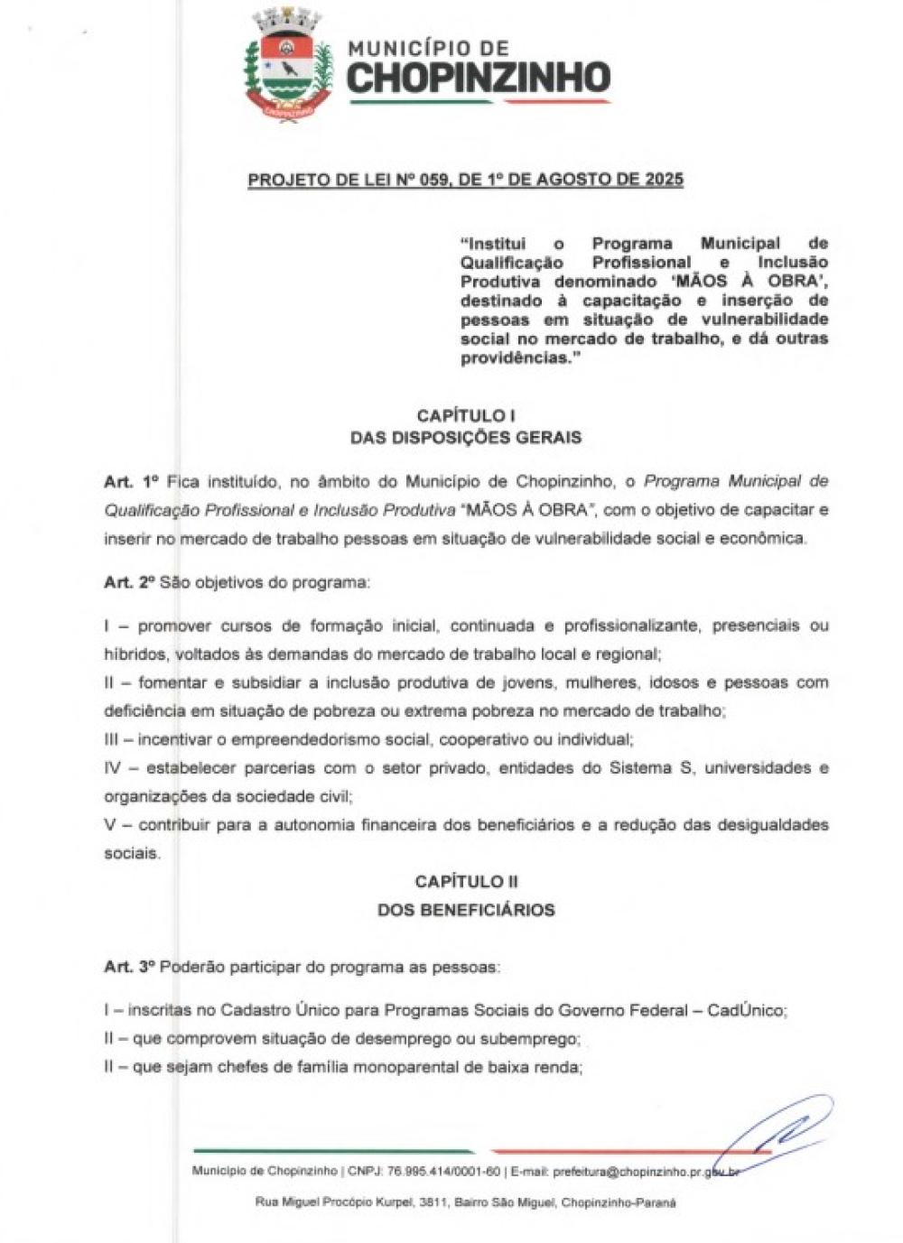 1ª votação Projeto de Lei Ordinária nº 59 de 2025, que institui o Programa Municipal de Qualificação Profissional e Inclusão Produtiva denominado ‘MÃOS À OBRA’, destinado à capacitação e inserção de pessoas em situação de vulnerabilidade social no mercado de trabalho, e dá outras providências.