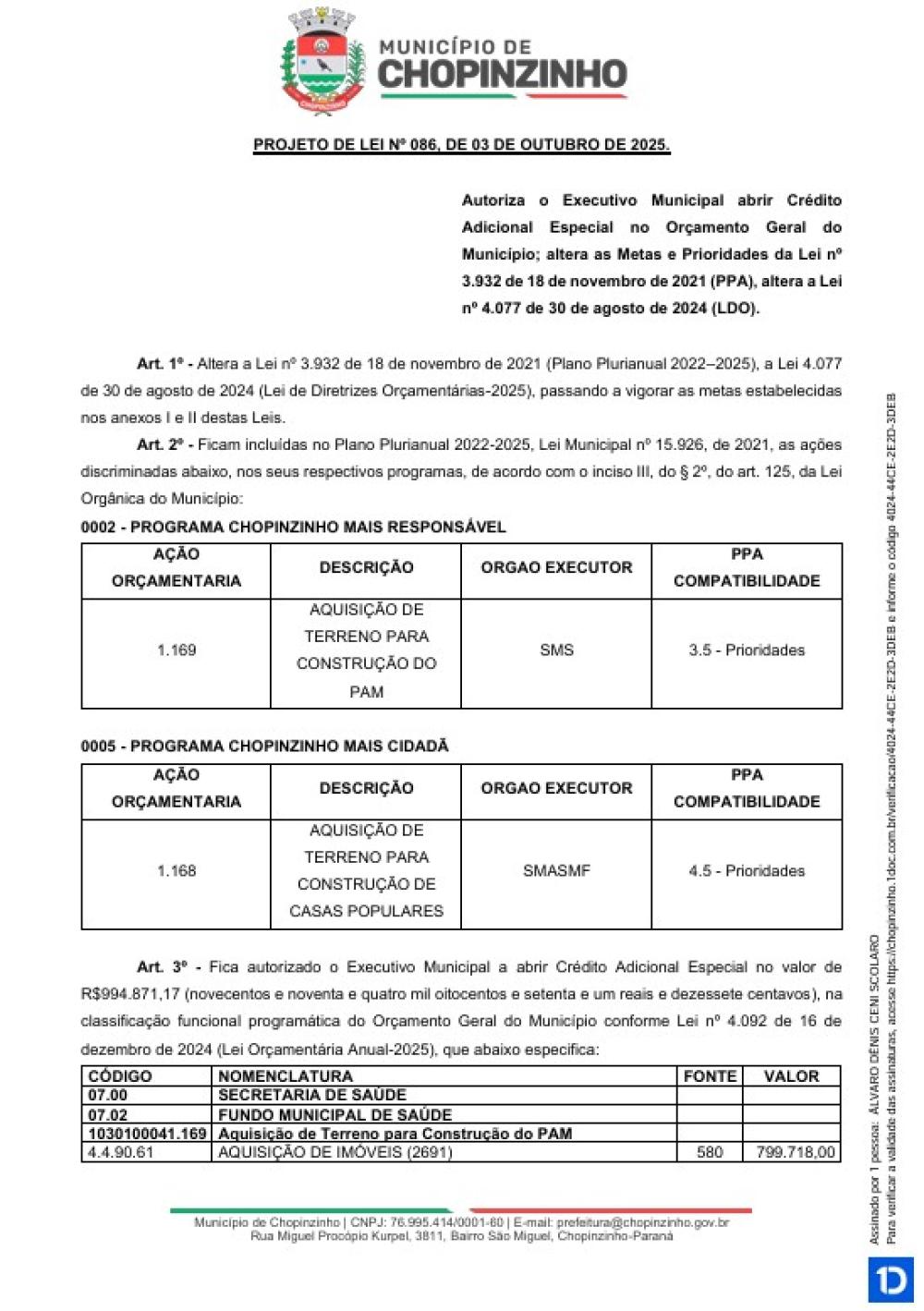 Votação única do Projeto de Lei Ordinária nº 86 de 2025, que autoriza o Executivo Municipal abrir Crédito Adicional Especial no Orçamento Geral do Município; altera as Metas e Prioridades da Lei nº3.932 de 18 de novembro de 2021 (PPA), altera a Lei nº 4.077 de 30 de agosto de 2024 (LDO).