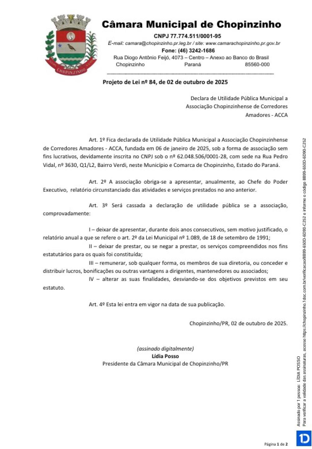 1ª votação do Projeto de Lei Ordinária nº 84 de 2025, de autoria da Vereadora Lídia Posso, tem como objetivo de declarar de Utilidade Pública Municipal a Associação Chopinzinhense de Corredores Amadores - ACCA