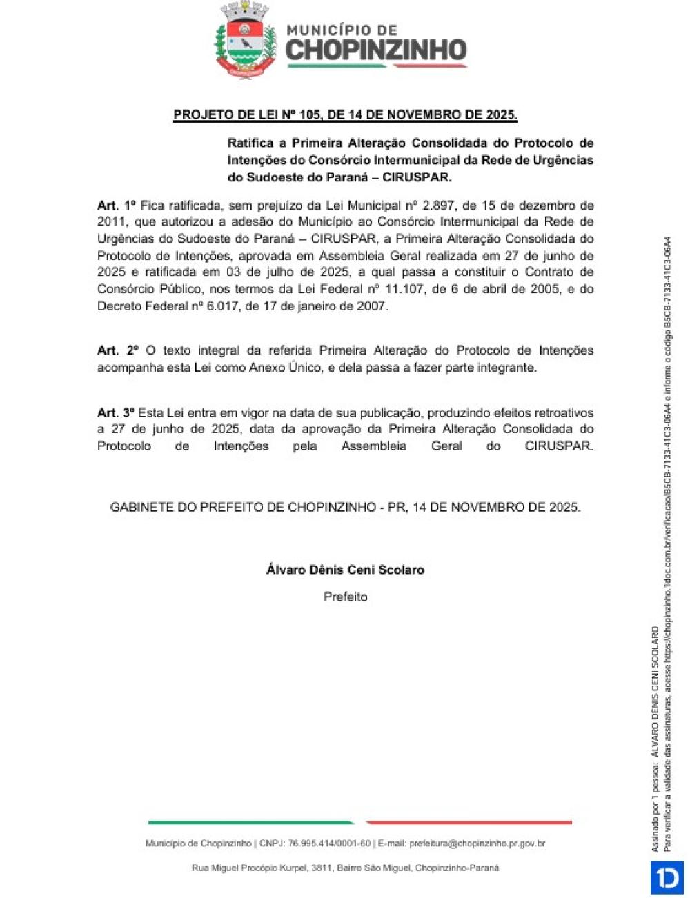 Votação única do Projeto de Lei Ordinária nº 105 de 2025, que ratifica a Primeira Alteração Consolidada do Protocolo de Intenções do Consórcio Intermunicipal da Rede de Urgências do Sudoeste do Paraná – CIRUSPAR.