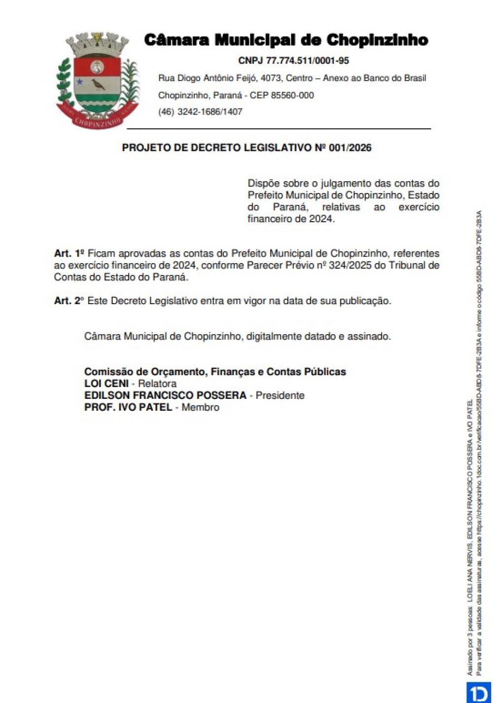O Projeto de Decreto Legislativo nº 1/2026, de autoria da Comissão de Orçamento, Finanças e Contas Públicas, dispõe sobre o julgamento das contas do Prefeito Municipal de Chopinzinho relativas ao exercício financeiro de 2024.