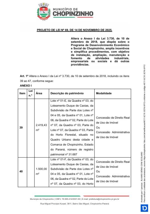 1ª votação do Projeto de Lei Ordinária nº 69 de 2025