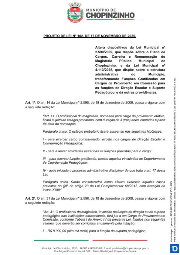 Votação única do Projeto de Lei Ordinária nº 102 de 2025