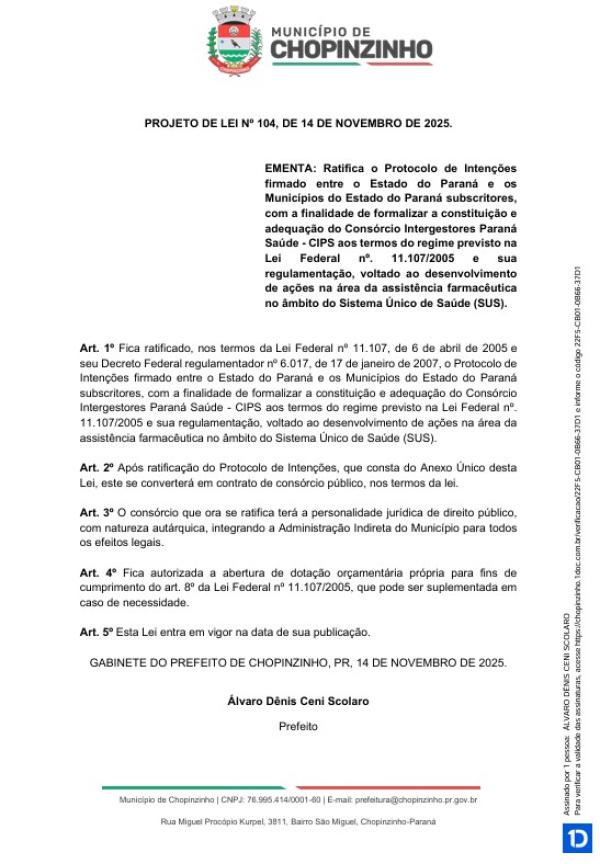 Votação única do Projeto de Lei Ordinária nº 104 de 2025