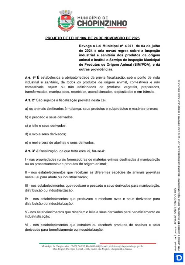 Votação única do Projeto de Lei Ordinária nº 106 de 2025