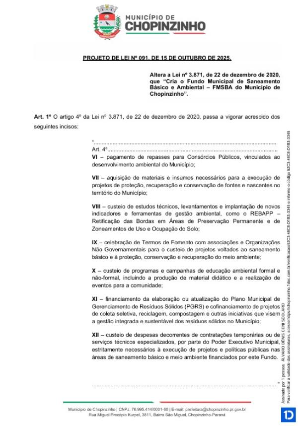 Votação única do Projeto de Lei Ordinária nº 91 de 2025