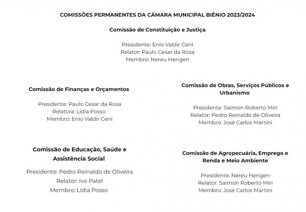 Já a Comissão de Obras, Serviços Públicos e Urbanismo foi composta pelos vereadores Saimon Roberto Miri do PL (presidente), Pedro Reinaldo de Oliveira (Pedrinho) do PSD (relator), José Carlos Martini (Zico) do Cidadania (membro);