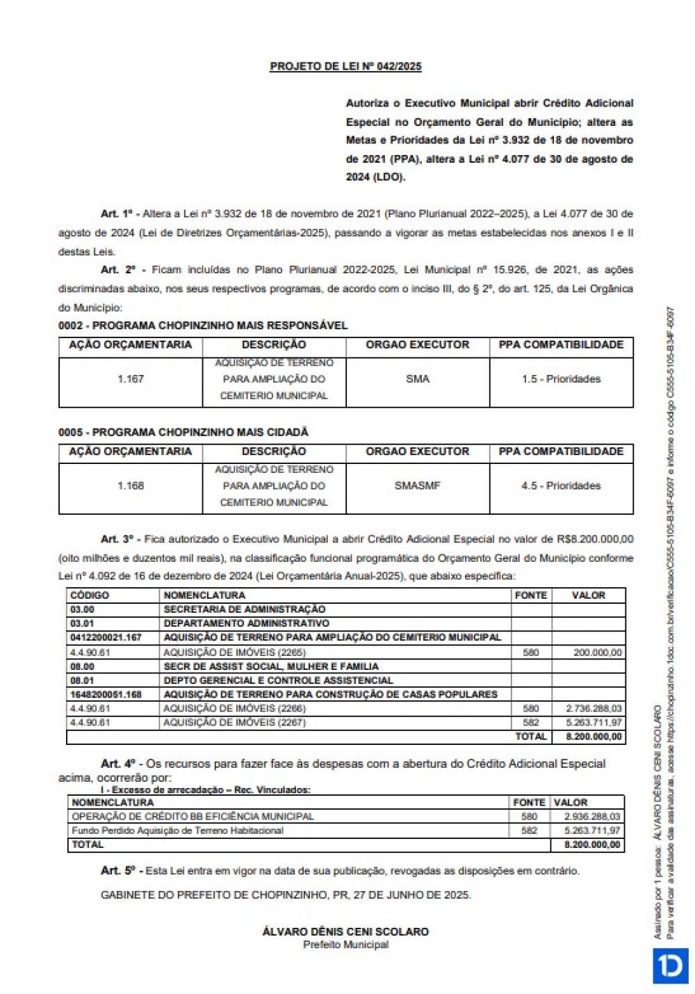 2ª Votação do Projeto de Lei Ordinária nº 42 de 2025, que autoriza o Executivo Municipal abrir Crédito Adicional Especial no Orçamento Geral do Município; altera as Metas e Prioridades da Lei nº 3.932 de 18 de novembro de 2021 (PPA), altera a Lei nº 4.077 de 30 de agosto de 2024 (LDO).