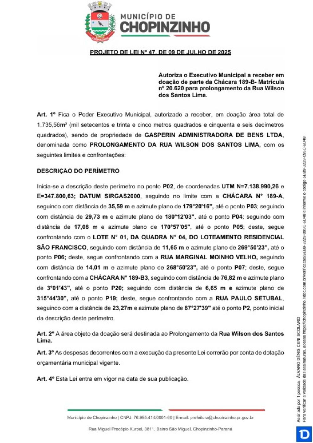 1ª Votação do Projeto de Lei Ordinária nº 47 de 2025, que autoriza o Executivo Municipal a receber em doação de parte da Chácara 189-B- Matrícula nº 20.620 para prolongamento da Rua Wilson dos Santos Lima.
