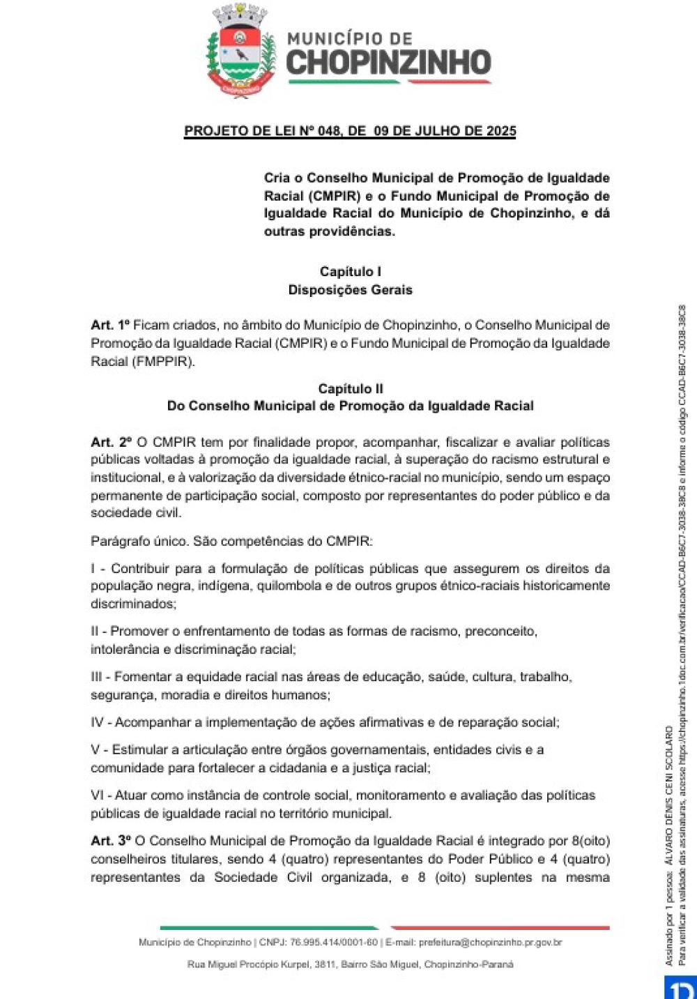 Promoção de Igualdade Racial do Município de Chopinzinho, e dá outras