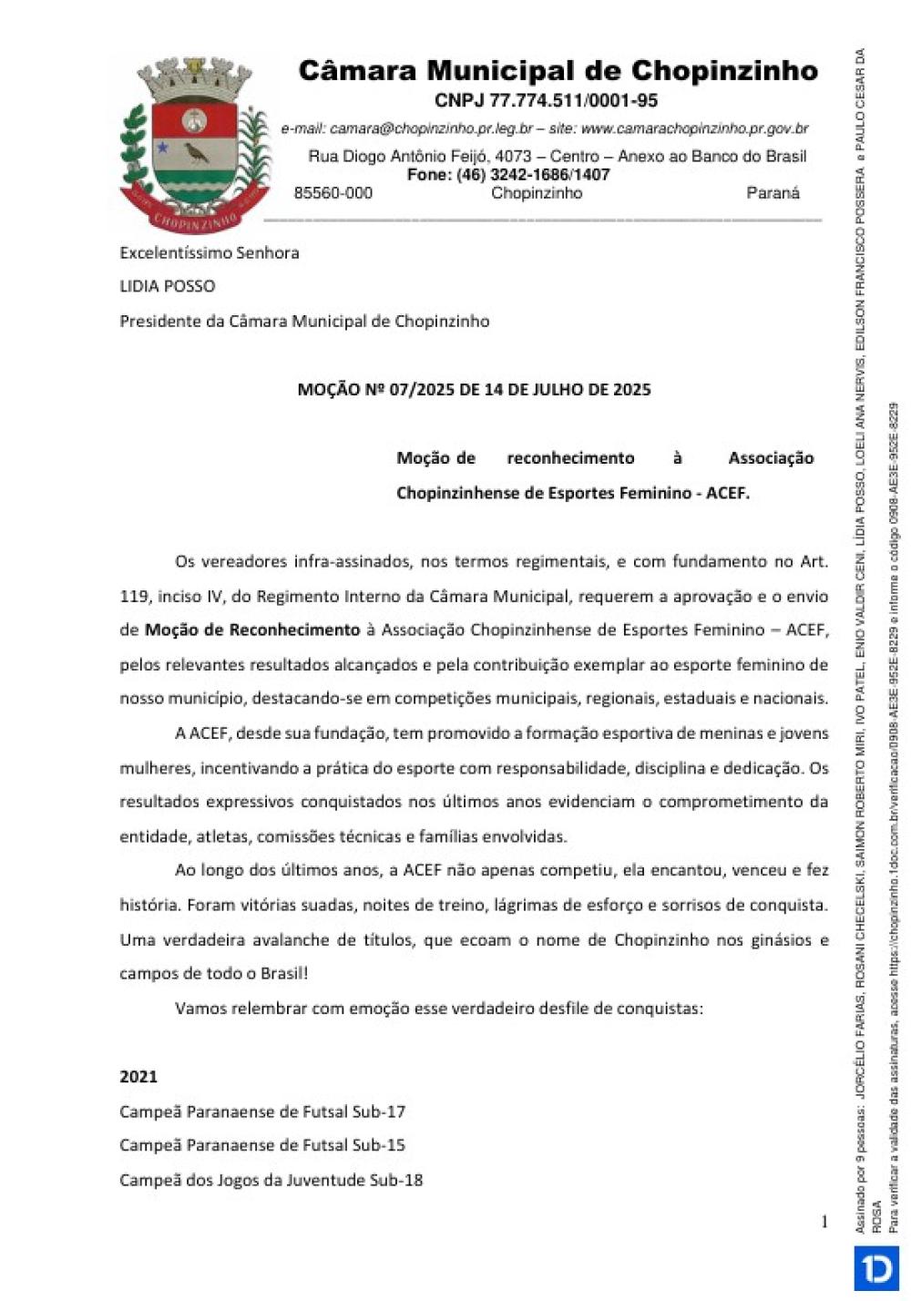 Aprovada Moção de reconhecimento à Associação Chopinzinhense de Esportes Feminino - ACEF.