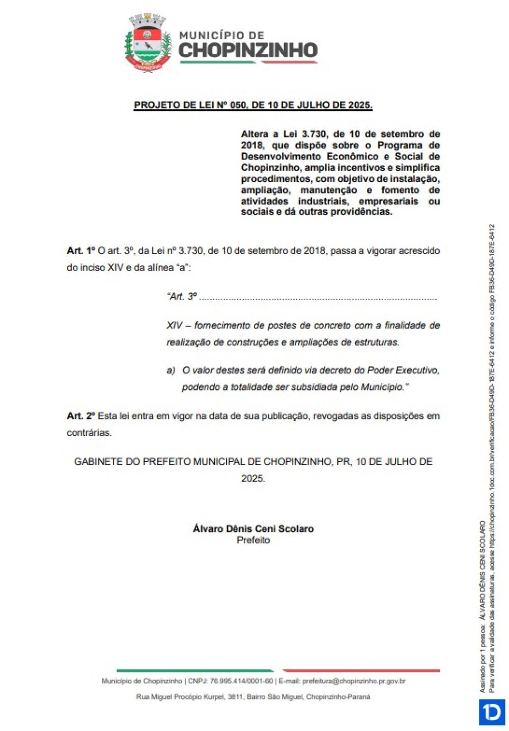 1ª votação do Projeto de Lei Ordinária nº 50 de 2025, que altera a Lei 3.730, de 10 de setembro de 2018, que dispõe sobre o Programa de Desenvolvimento Econômico e Social de Chopinzinho, amplia incentivos e simplifica procedimentos, com objetivo de instalação, ampliação, manutenção e fomento de atividades industriais, empresariais ou sociais e dá outras providências.