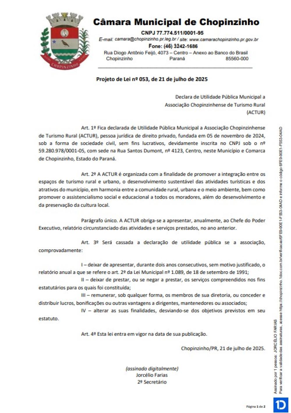 2ª Votação Projeto de Lei Ordinária nº 53 de 2025, projeto de autoria do Vereador Jorcélio Farias, que tem como objetivo declarar de Utilidade Pública Municipal a Associação Chopinzinhense de Turismo Rural