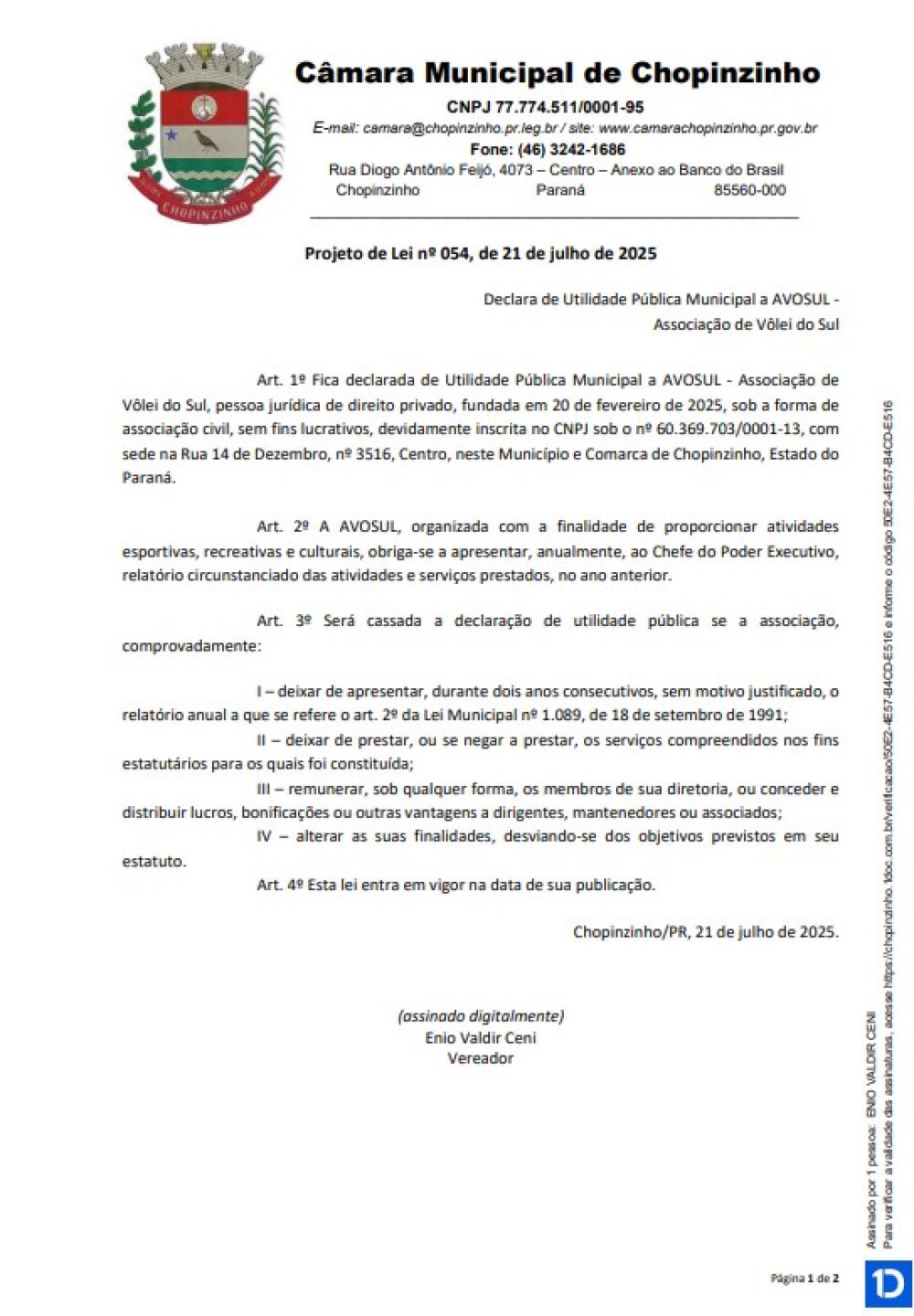 2ª Votação Projeto de Lei Ordinária nº 54 de 2025, projeto de autoria do Vereador Professor Enio, que tem como objetivo declarar de Utilidade Pública Municipal a AVOSUL - Associação de Vôlei do Sul