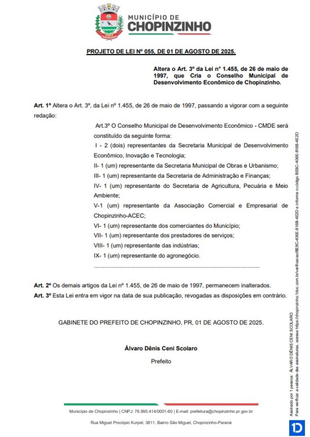 1ª votação do Projeto de Lei Ordinária nº 55 de 2025, que altera o Art. 3º da Lei n° 1.455, de 26 de maio de 1997, que Cria o Conselho Municipal de Desenvolvimento Econômico de Chopinzinho.