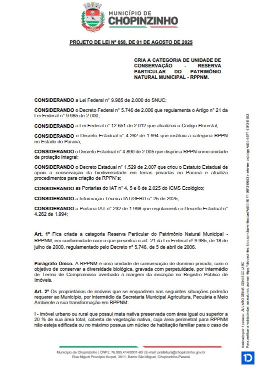 1ª votação do Projeto de Lei Ordinária nº 58 de 2025, que cria a categoria de unidade de conservação - reserva particular do patrimônio natural municipal - rppnm.