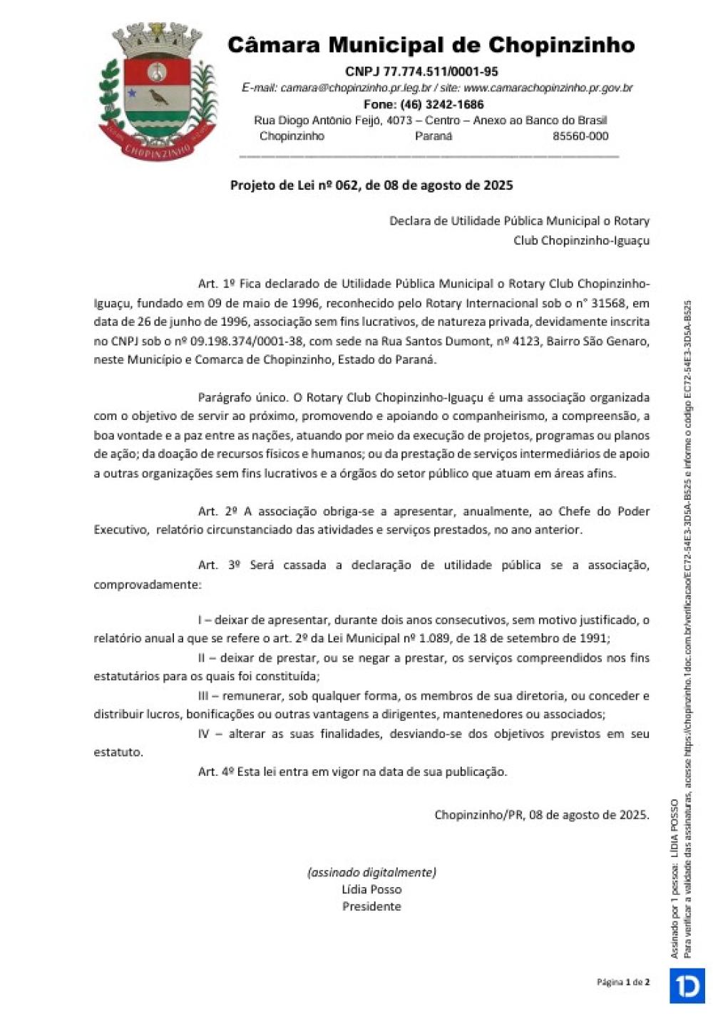 Autora: Vereadora Lídia PossoDeclara de Utilidade Pública Municipal o Rotary Club Chopinzinho-Iguaçu.