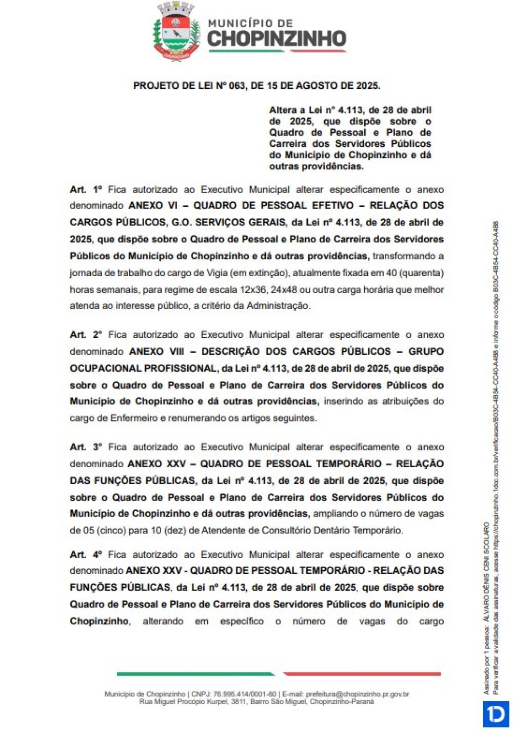 1ª votação do Projeto de Lei Ordinária nº 63 de 2025, que altera a Lei n° 4.113, de 28 de abril de 2025, que dispõe sobre o Quadro de Pessoal e Plano de Carreira dos Servidores Públicos do Município de Chopinzinho e dá outras providências.