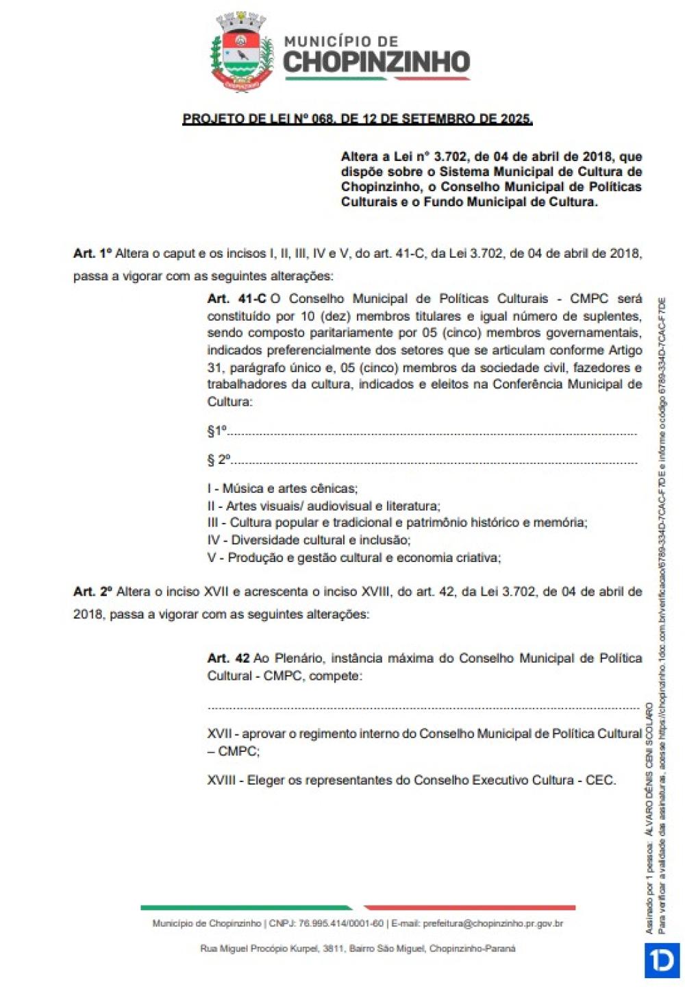 Votação única do Projeto de Lei Ordinária nº 68 de 2025, que altera a Lei n° 3.702, de 04 de abril de 2018, que dispõe sobre o Sistema Municipal de Cultura de Chopinzinho, o Conselho Municipal de Políticas Culturais e o Fundo Municipal de Cultura.