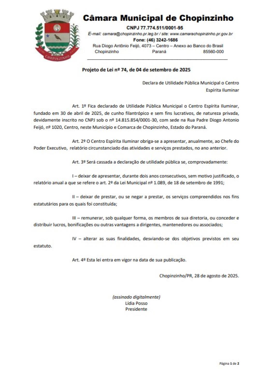 1ª votação do Projeto de Lei Ordinária nº 74 de 2025, que declara de Utilidade Pública Municipal o Centro Espírita Iluminar e votação única da Emenda nº 22 de 2025, Emenda Modificativa nº 01 ao Projeto de Lei nº 74/2025