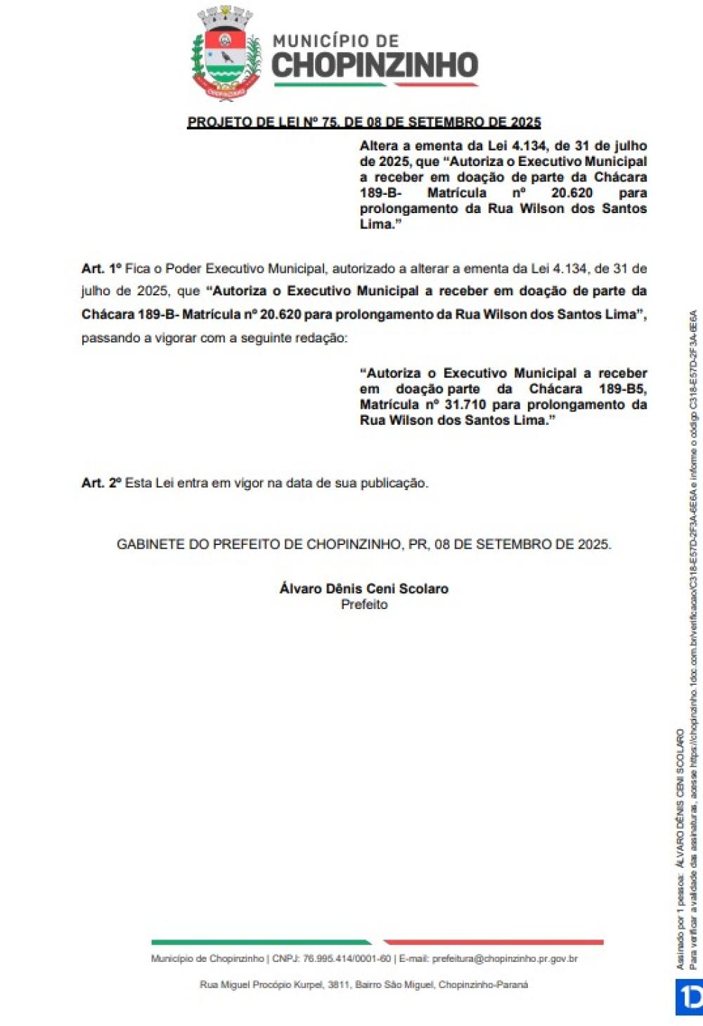 1ª votação do Projeto de Lei Ordinária nº 75 de 2025, que altera a ementa da Lei 4.134, de 31 de julho de 2025, que “Autoriza o Executivo Municipal a receber em doação de parte da Chácara 189-B- Matrícula nº 20.620 para prolongamento da Rua Wilson dos Santos Lima.”