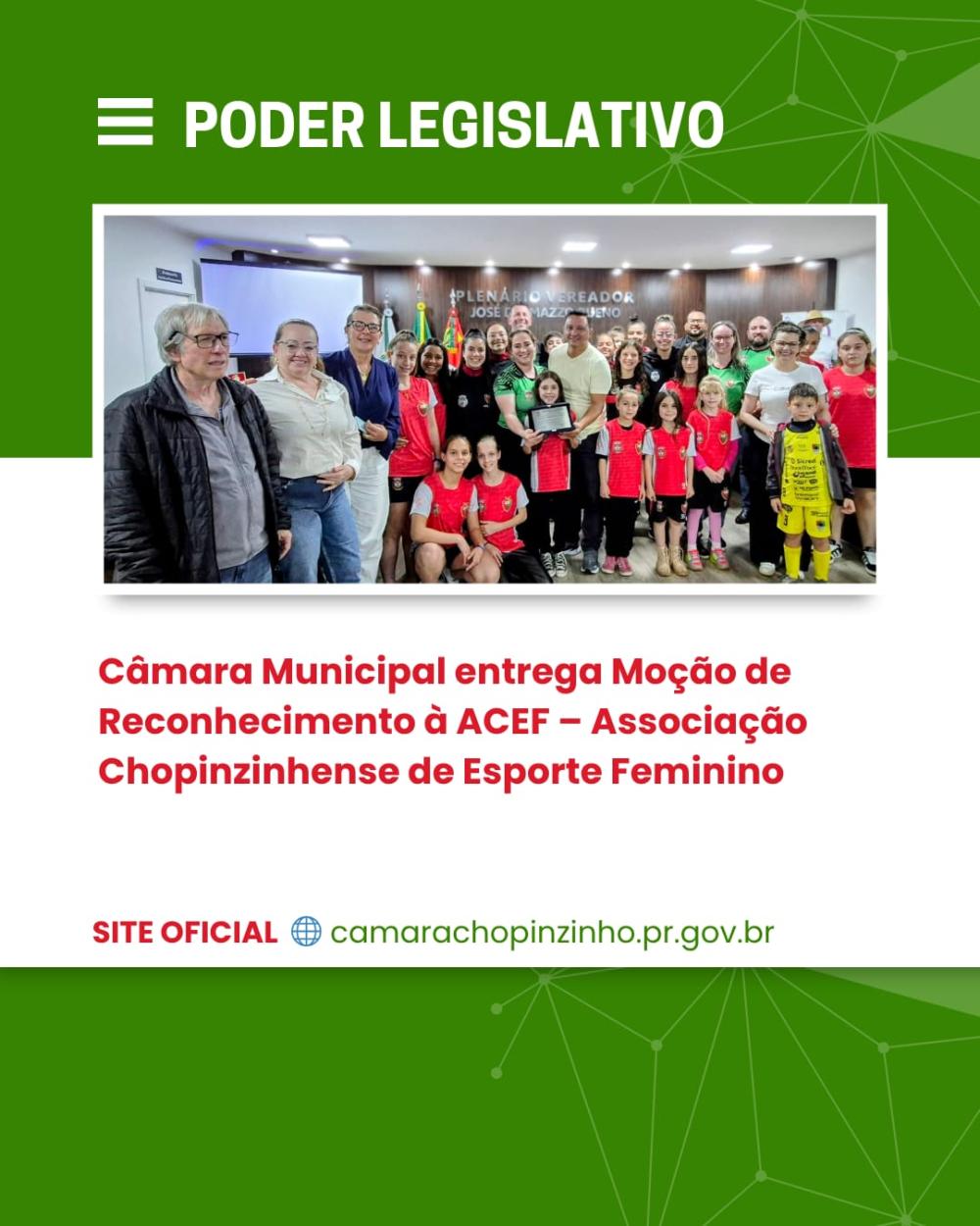 A Câmara Municipal de Chopinzinho realizou a entrega de uma Moção de Reconhecimento à ACEF – Associação Chopinzinhense de Esporte Feminino, em homenagem ao importante trabalho desenvolvido em prol do esporte e da valorização das mulheres no município. A honraria destaca o empenho da entidade na promoção do esporte feminino, incentivando a participação das atletas em diferentes modalidades, fortalecendo a integração social e contribuindo para o desenvolvimento esportivo e comunitário. Durante a solenidade, os vereadores ressaltaram a relevância da ACEF como exemplo de organização, dedicação e inspiração para as futuras gerações. O reconhecimento reafirma o compromisso do Legislativo em valorizar iniciativas que fortalecem o esporte e elevam o nome de Chopinzinho. A Câmara Municipal parabeniza a Associação Chopinzinhense de Esporte Feminino, suas atletas, dirigentes e colaboradores, pelo esforço contínuo e pelos resultados conquistados, que orgulham a comunidade chopinzinhense.