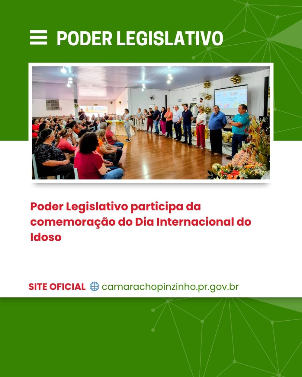 A Câmara Municipal de Chopinzinho marcou presença na comemoração do Dia Internacional do Idoso, realizada com o objetivo de valorizar e reconhecer a importância da terceira idade para a nossa comunidade.Na ocasião, o Poder Legislativo esteve representado por sua presidente e demais vereadores, reforçando o compromisso em apoiar iniciativas que promovem a qualidade de vida, o respeito e a dignidade dos idosos.O evento contou com momentos de integração, confraternização e atividades voltadas ao bem-estar, destacando a relevância de políticas públicas voltadas a essa parcela tão significativa da população.