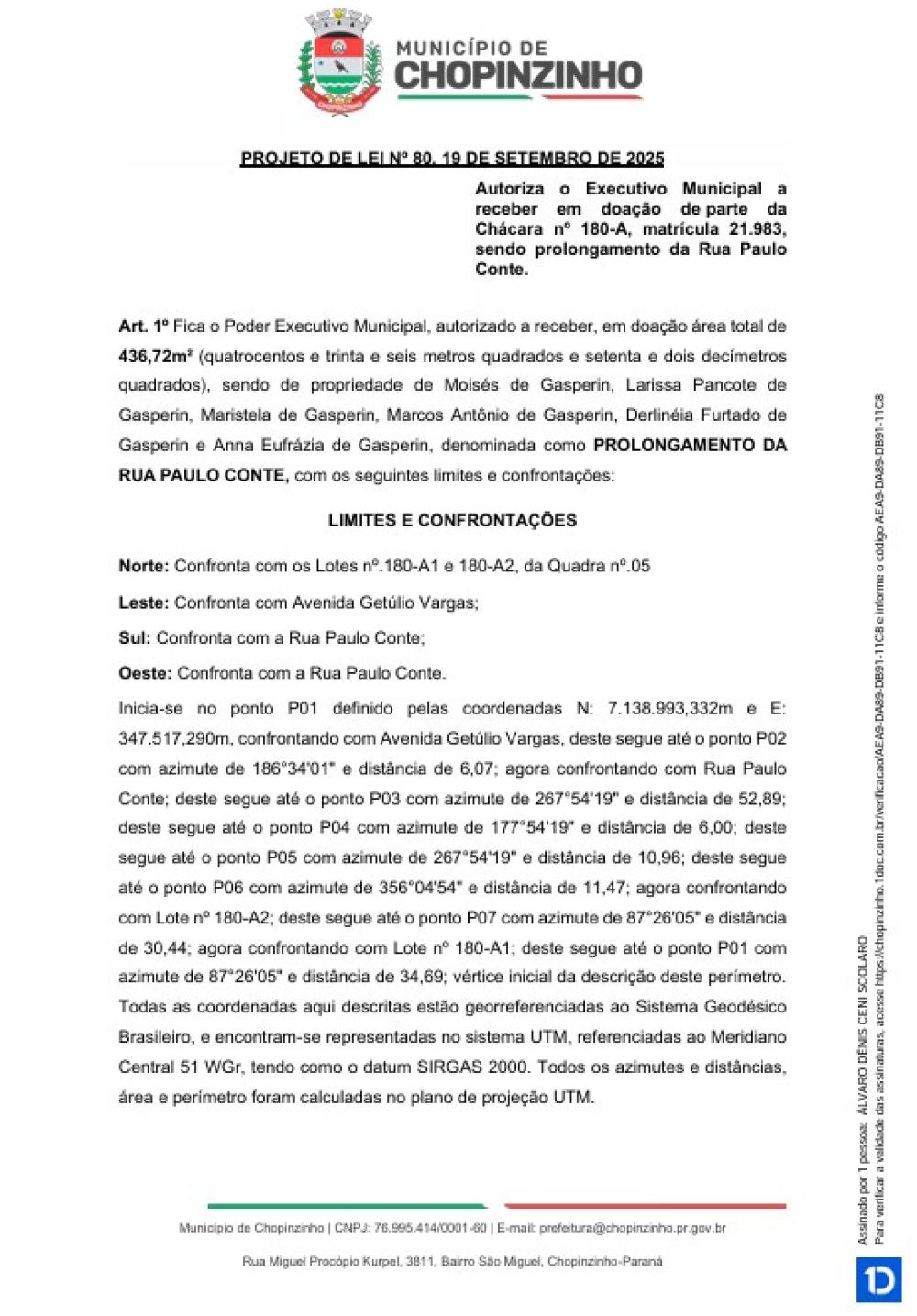 1ª votação do Projeto de Lei Ordinária nº 80 de 2025, que autoriza o Executivo Municipal a receber em doação de parte da Chácara nº 180-A, matrícula 21.983, sendo prolongamento da Rua Paulo Conte.