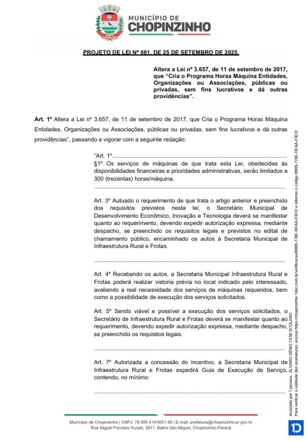 1ª votação do Projeto de Lei Ordinária nº 81 de 2025, que altera a Lei nº 3.657, de 11 de setembro de 2017, que “Cria o Programa Horas Máquina Entidades, Organizações ou Associações, públicas ou privadas, sem fins lucrativos e dá outras providências”