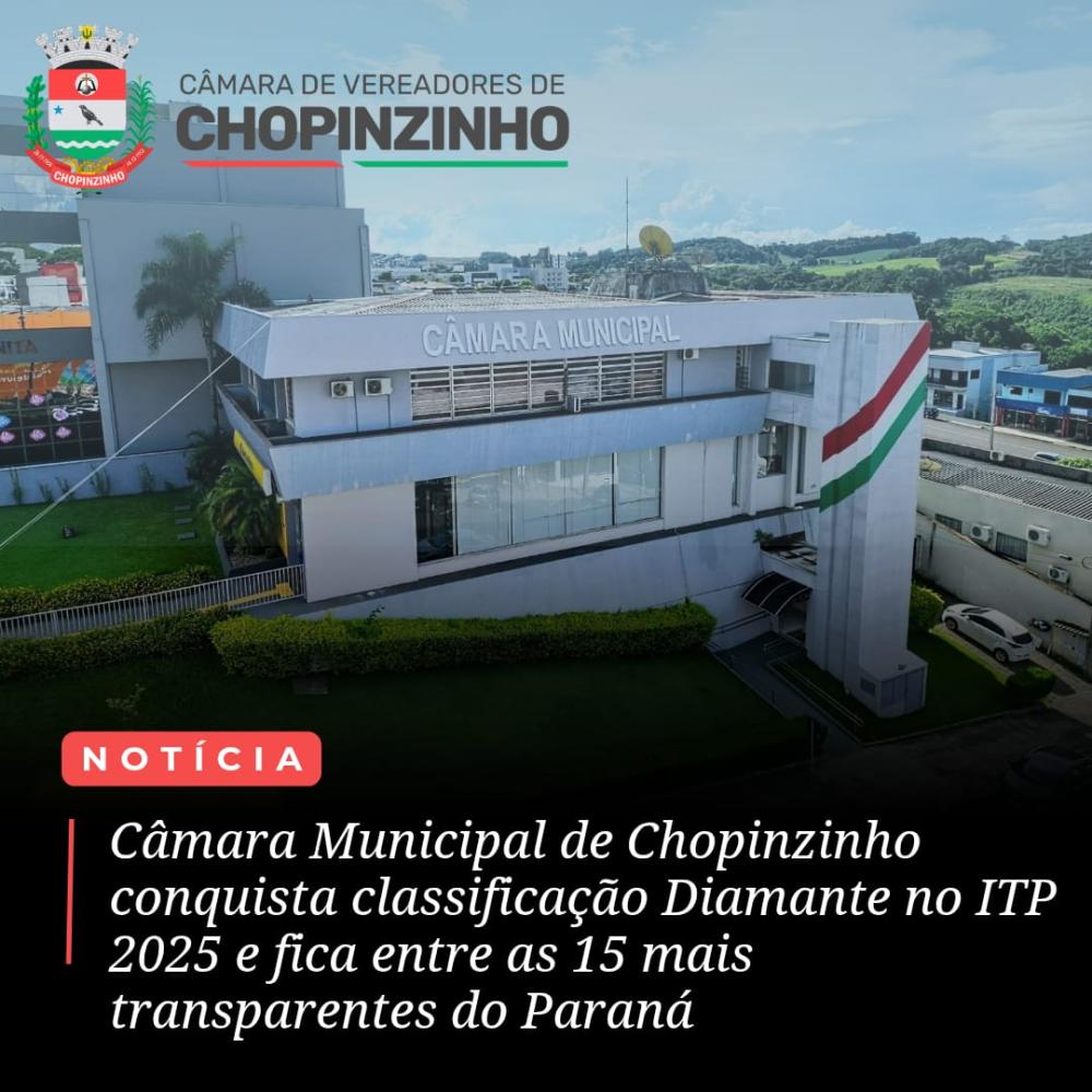 A Câmara Municipal de Chopinzinho alcançou um resultado de destaque no Índice de Transparência da Administração Pública (ITP) 2025, avaliação realizada anualmente pelo Tribunal de Contas do Estado do Paraná (TCE-PR). Na edição deste ano, o Legislativo chopinzinhense obteve a 14ª colocação entre os 386 municípios avaliados, conquistando a certificação Diamante, o nível máximo de transparência reconhecido pelo órgão.
