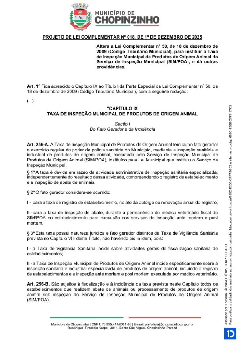1ª votação do Projeto de Lei Complementar nº 18 de 2025, que altera a Lei Complementar nº 50, de 18 de dezembro de 2009 (Código Tributário Municipal), para instituir a Taxa de Inspeção Municipal de Produtos de Origem Animal do Serviço de Inspeção Municipal (SIM/POA)