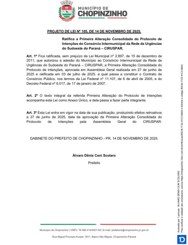 Votação única do Projeto de Lei Ordinária nº 105 de 2025