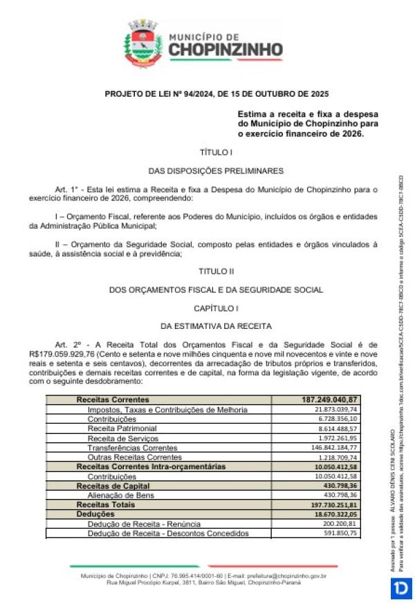Votação única do Projeto de Lei Ordinária nº 94 de 2025 e das Emendas impositivas