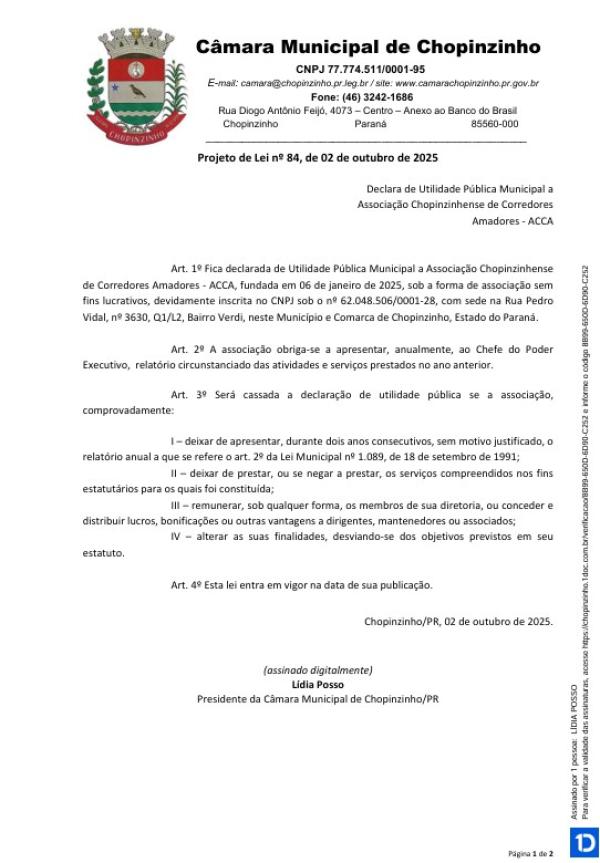 1ª votação do Projeto de Lei Ordinária nº 84 de 2025