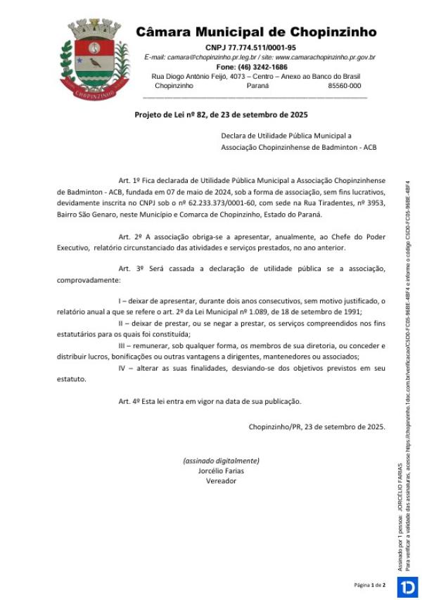 1ª votação do Projeto de Lei Ordinária nº 82 de 2025