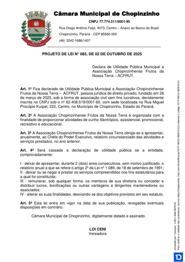 1ª votação do Projeto de Lei Ordinária nº 85 de 2025