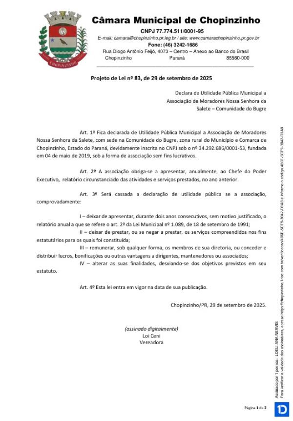 1ª votação do Projeto de Lei Ordinária nº 83 de 2025