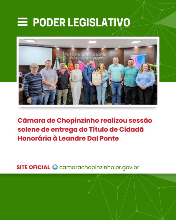 A Câmara Municipal de Chopinzinho realizou sessão solene para a entrega do Título de Cidadã Honorária à Sra. Leandre Dal Ponte
