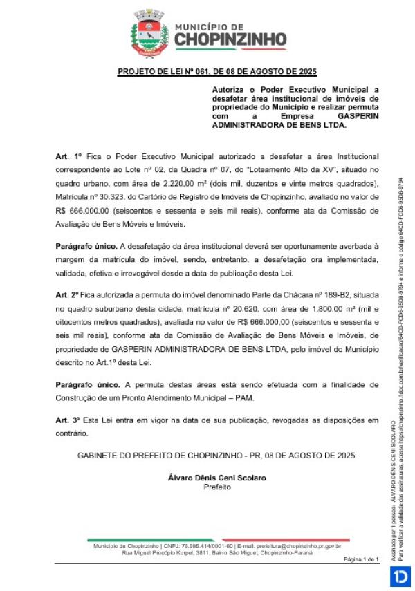 Votação Única do Projeto de Lei Ordinária nº 61/2025