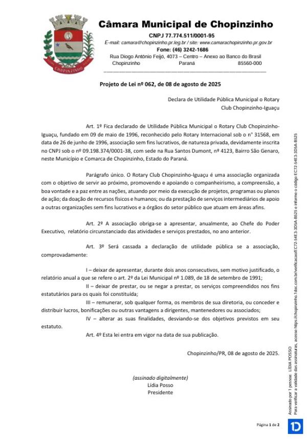 1° votação do Projeto de Lei Ordinária nº 62/2025