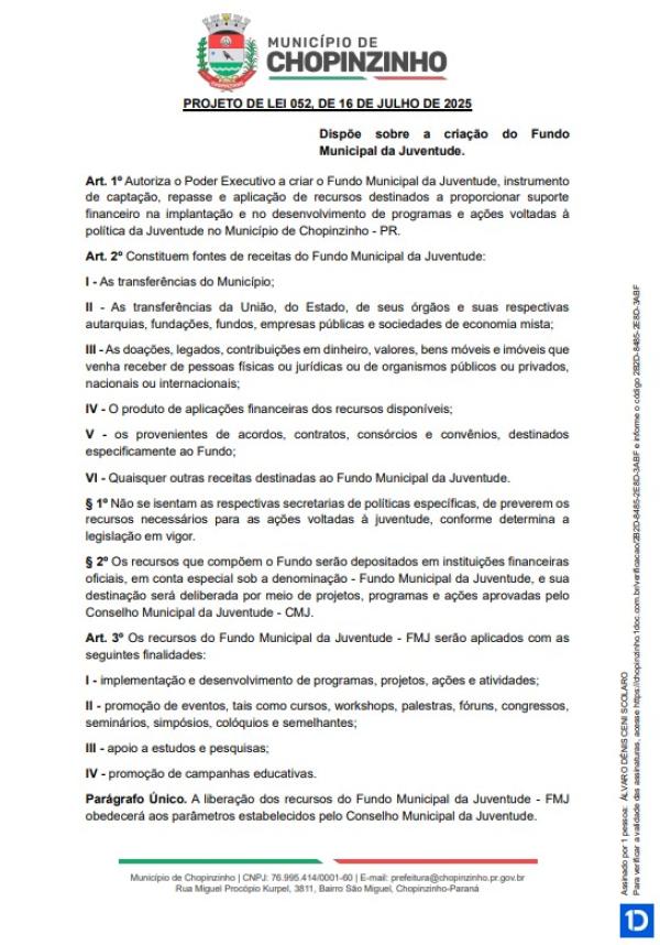 Votação do Projeto de Lei Ordinária nº 52 de 2025 e Emenda Modificativa nº 01/2025