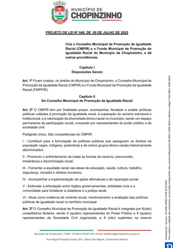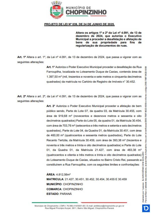 1ª apreciação do Projeto de Lei Ordinária nº 39 de 2025