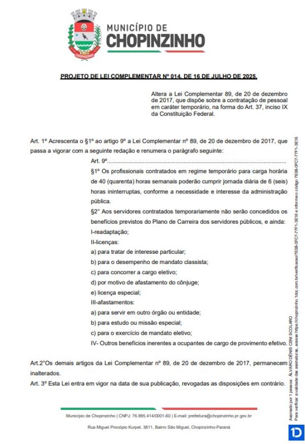 1° votação do Projeto de Lei Complementar nº 14 de 2025